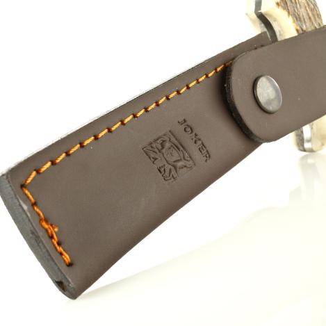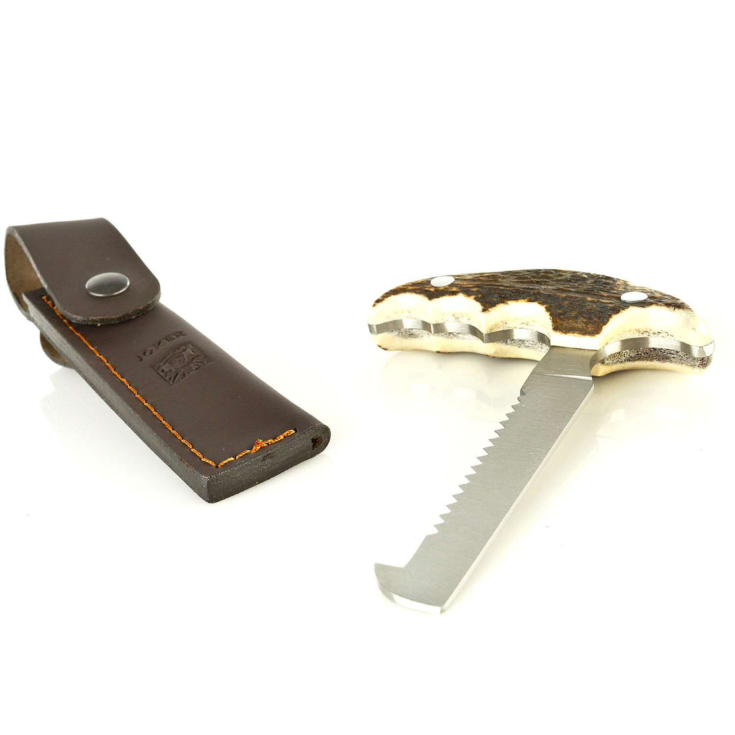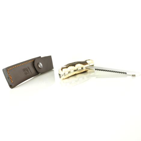 Schloss-Aufbrech-Säge - Hirschhorn Deluxe: hochwertige, formschöne und funktionale Schloss-Aufbrechsäge aus rostfreiem Edelstahl mit 3-kantigen Profilzähnen - zum effektiven Durchtrennen von Schloss und Rippen. Mit echten Hirschhorn-Griffschalen und Leder-Gürtel-Etui aus Sattler-Leder. Gesamtlänge: 14,5cm, Länge Sägeblatt: 9,5cm.
