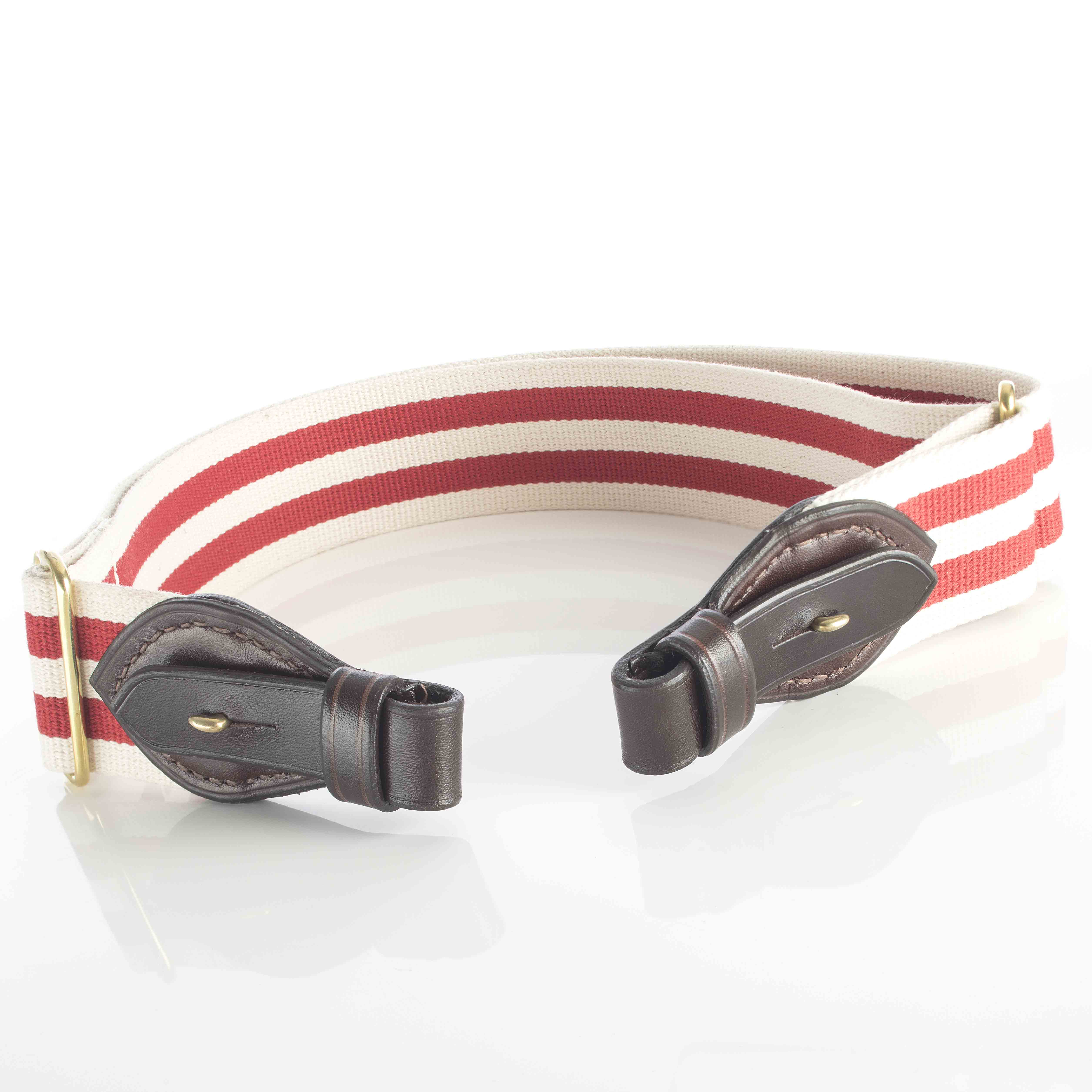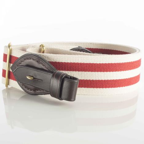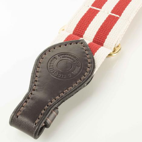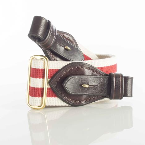 Paul & Kloosterhuis - Safari-Gewehrriemen - Limitierte Sonderedition - Red-Stripes: klassischer Safari-Gewehrriemen im englischen Stil - aufwendig gefertigt in reiner Handarbeit - in unserer Sattler-Manufaktur in Coburg / Deutschland. Der Safari-Gewehrriemen wird aus traditionellen Materialien, so wie die Originale aus der Kolonialzeit, gefertigt: vegetabil gegerbtes und nahezu unverwüstliches Kern-Rindleder in einer Stärke von 5mm - dazu original englisches "Hard Wearing Canvas" höchster Gütequalität sowie original englische Messing-Beschläge aus einer kleinen Manufaktur, die auch das englische Königshaus beliefert. Die Lederteile werden von unserem Sattlermeister von Hand zugeschnitten und auch aufwendig von Hand vernäht. Das besondere Finish erhalten die Safari-Gewehrriemen über das liebevolle "aufputzen" der Kanten, das sorgfältige Kanten färben sowie über die farblich abgesetzten Linien-Zier-Phasen. Somit ist jeder Gewehrriemen ein besonderes Einzelstück - ein wertvolles Unikat. Ein Blickfang an jeder klassischen Jagdwaffe - nicht nur für eine Safari-Express-Rifle oder Side-By-Side - Doppelbüchse.